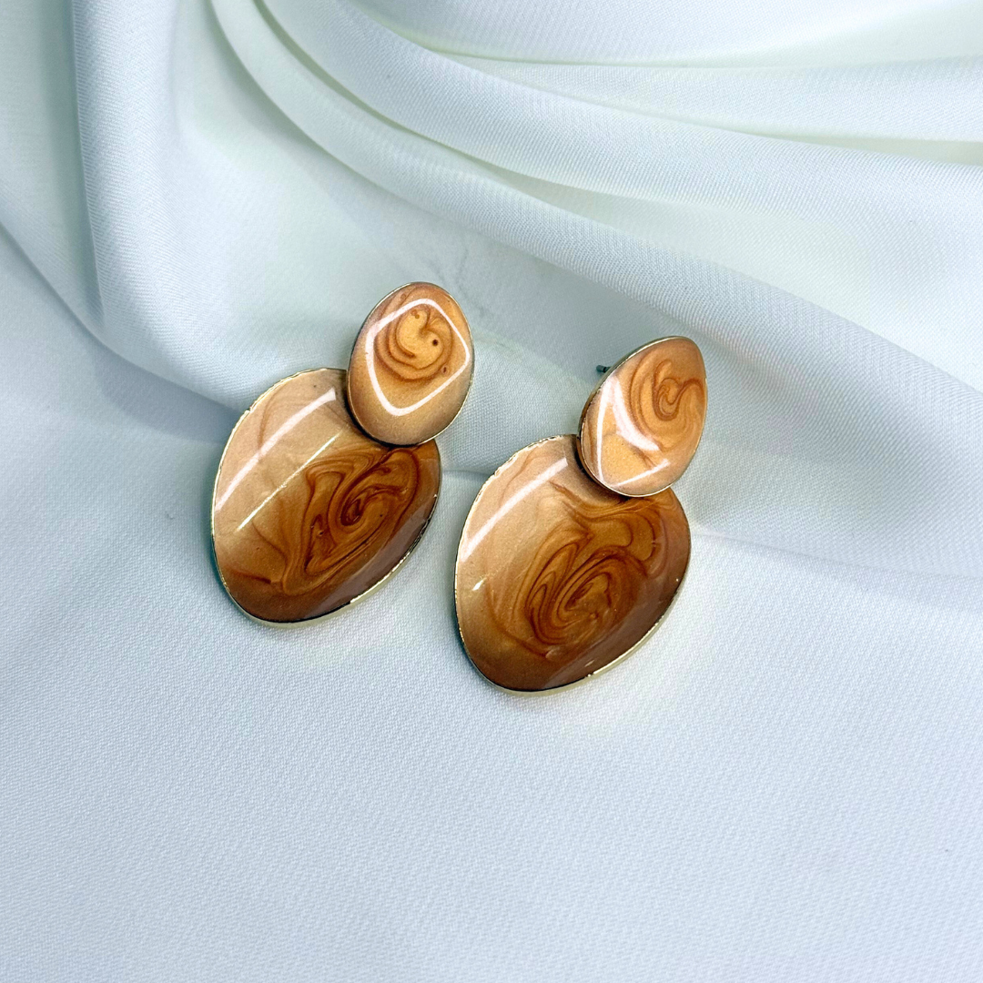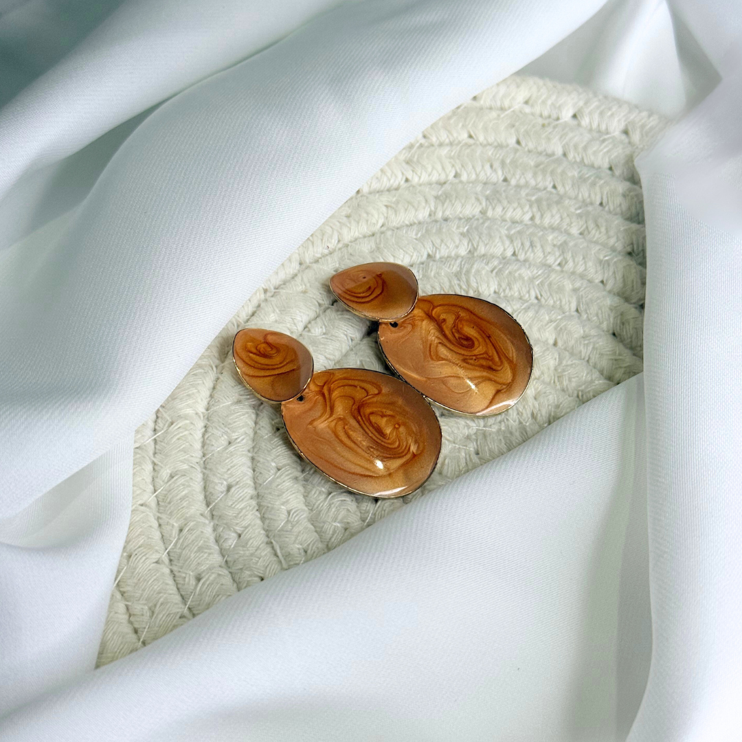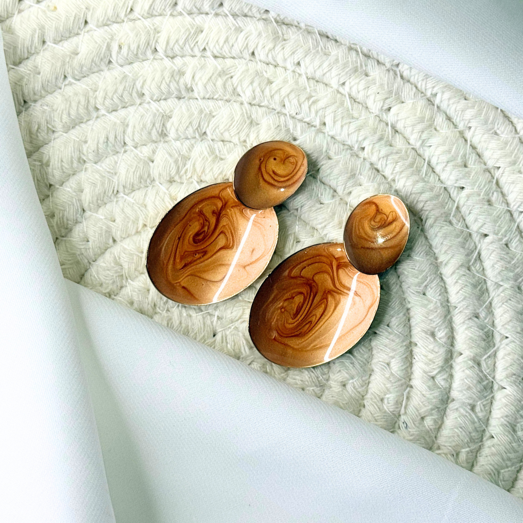 Warm caramel swirls in an elegant double-oval silhouette. Earthy, artistic and beautifully unique.