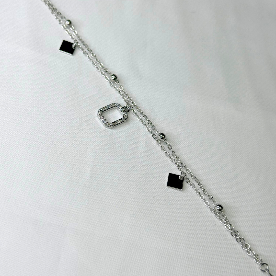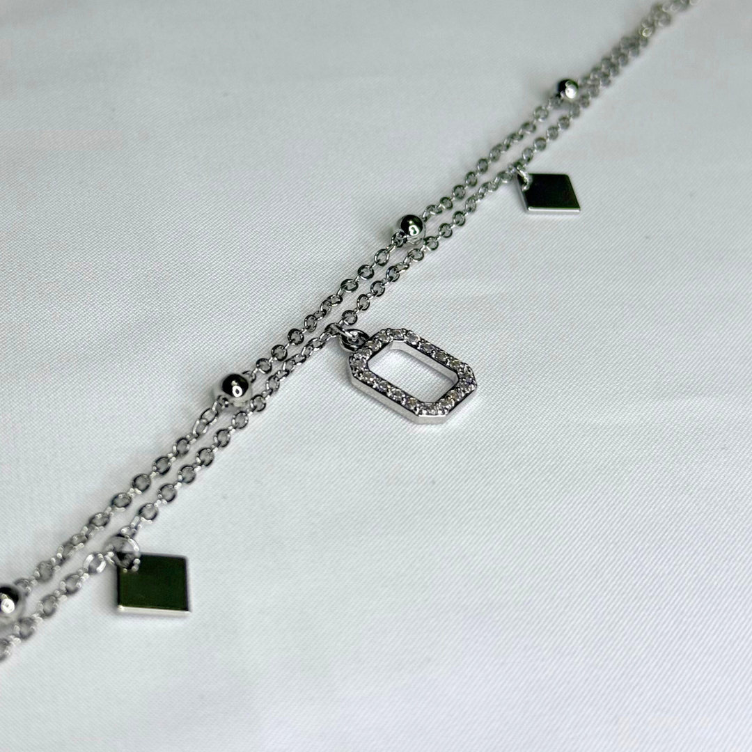 A sleek silver chain with tiny geometric drops for a clean, contemporary feel. Minimal and versatile.