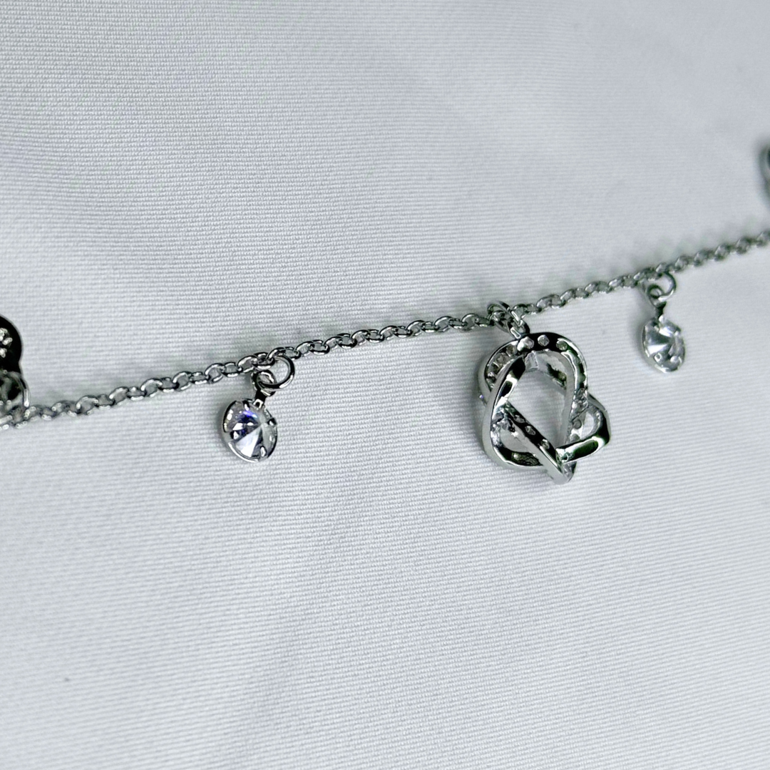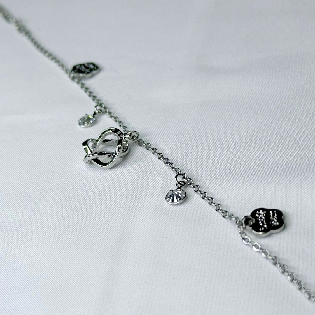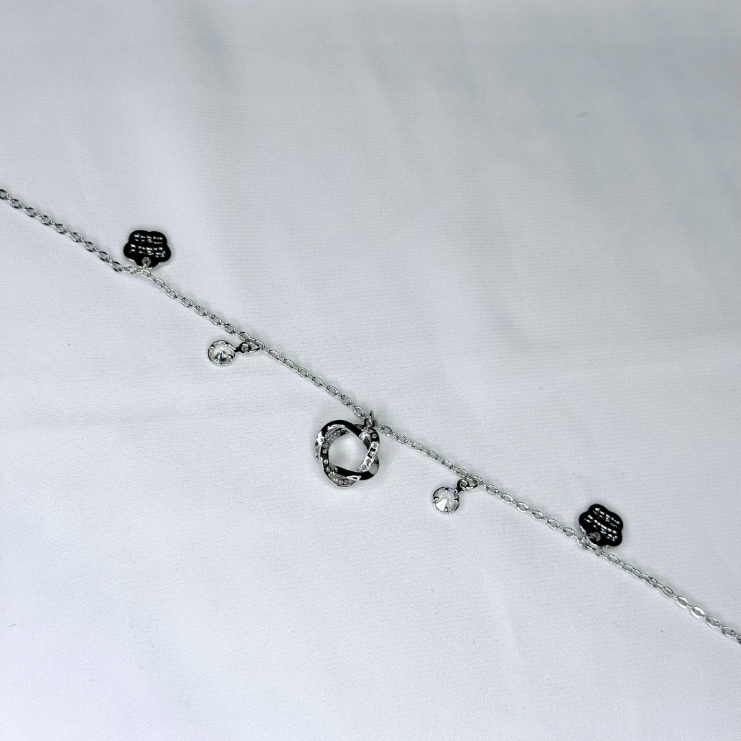 A modern silver chain decorated with small textured charms. Polished, minimal, and great for everyday styling.