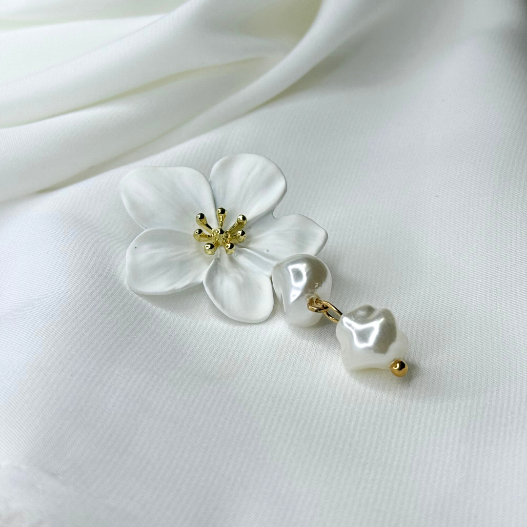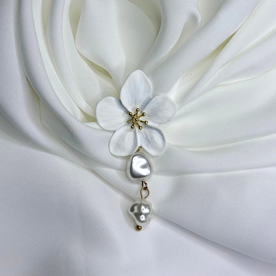 Romantic white blossoms paired with soft pearl drops. Feminine, dreamy and perfect for special occasions or brunch days.